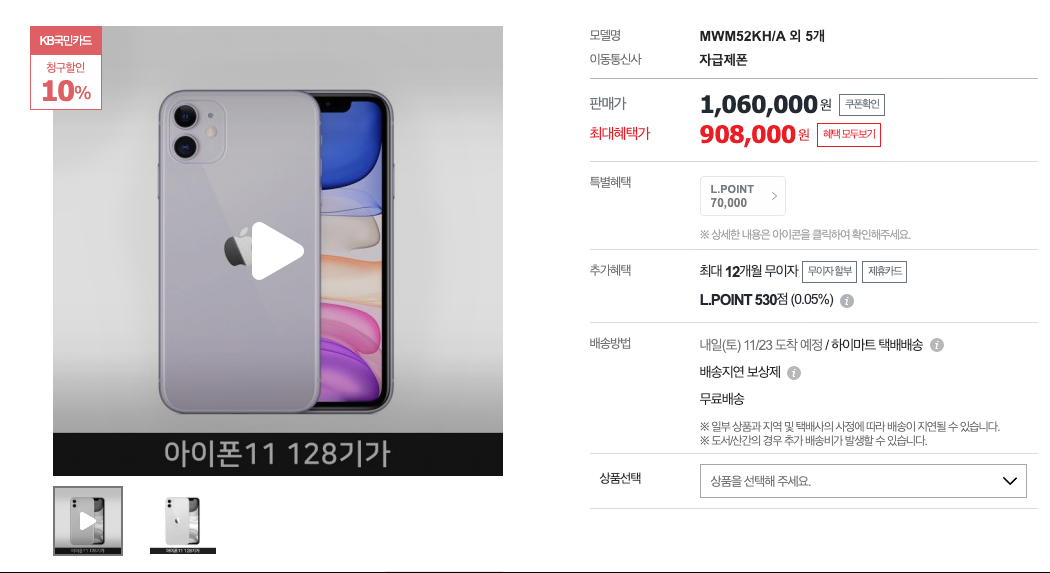 | 아이폰 11 모델 (iPhone 11) * KB국민 카드 소지자만 해당 / 11월 23일 카드할인 행사 종료 |
