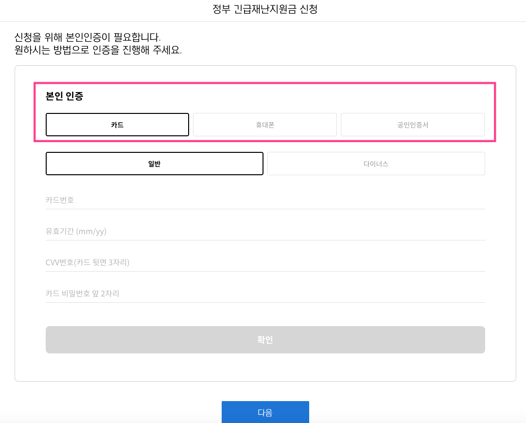 카드/휴대폰/공인인증서 중 선택하여 본인인증을 합니다.