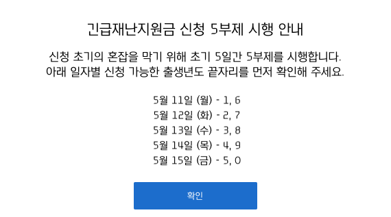 위의 사진 처럼 5월 15일까지는 정해진 마스크와 동일하게 출생년도 끝자리에 따라 신청이 가능합니다.