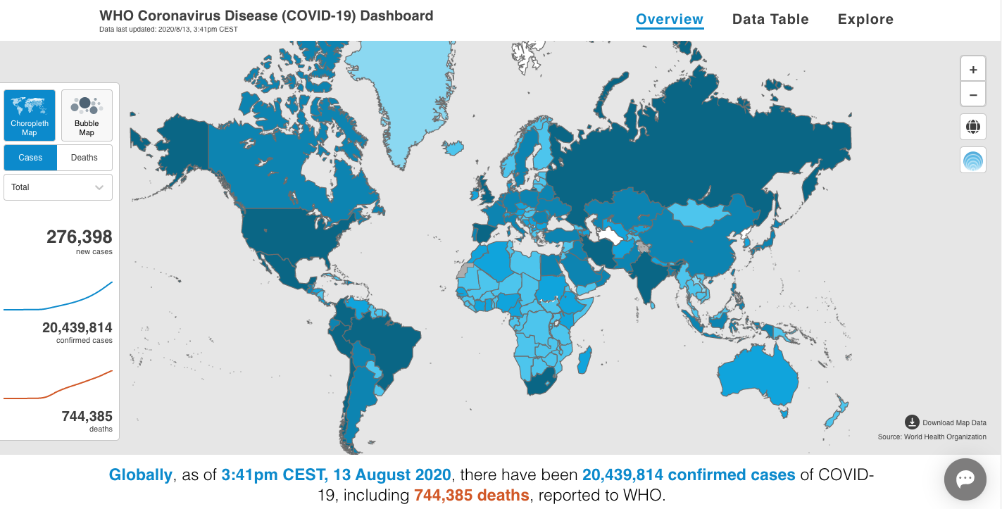 WHO 에서 제공하는 전세계 코로나 현황 맵입니다.