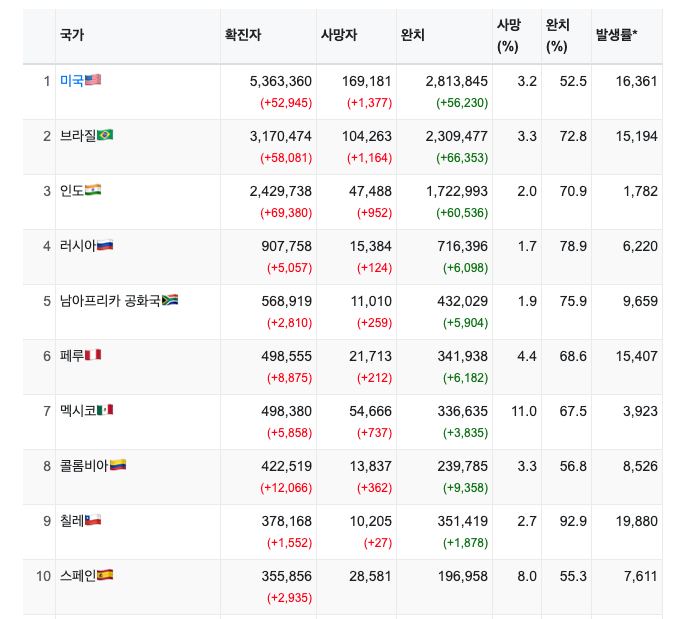 인도뿐 아니라 남미(멕시코/페루), 아프리카대륙에선 남아프리카공화국이 코로나로 인해 큰 피해를 입고 있었고 그럼 얼마나 퍼졌는지 알아보도록 하겠습니다.