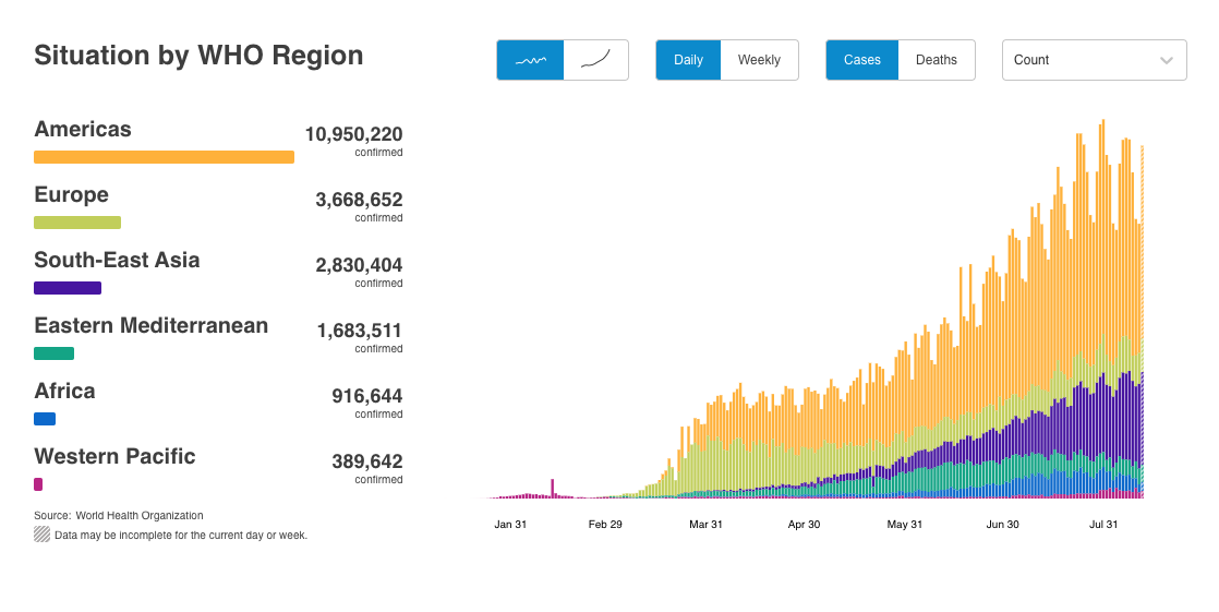 대륙별 통계 자료로 일부 지역은 정점을 찍은 후 내려 오고있지만, 유럽은 다시 증가폭이 커지고 있습니다.