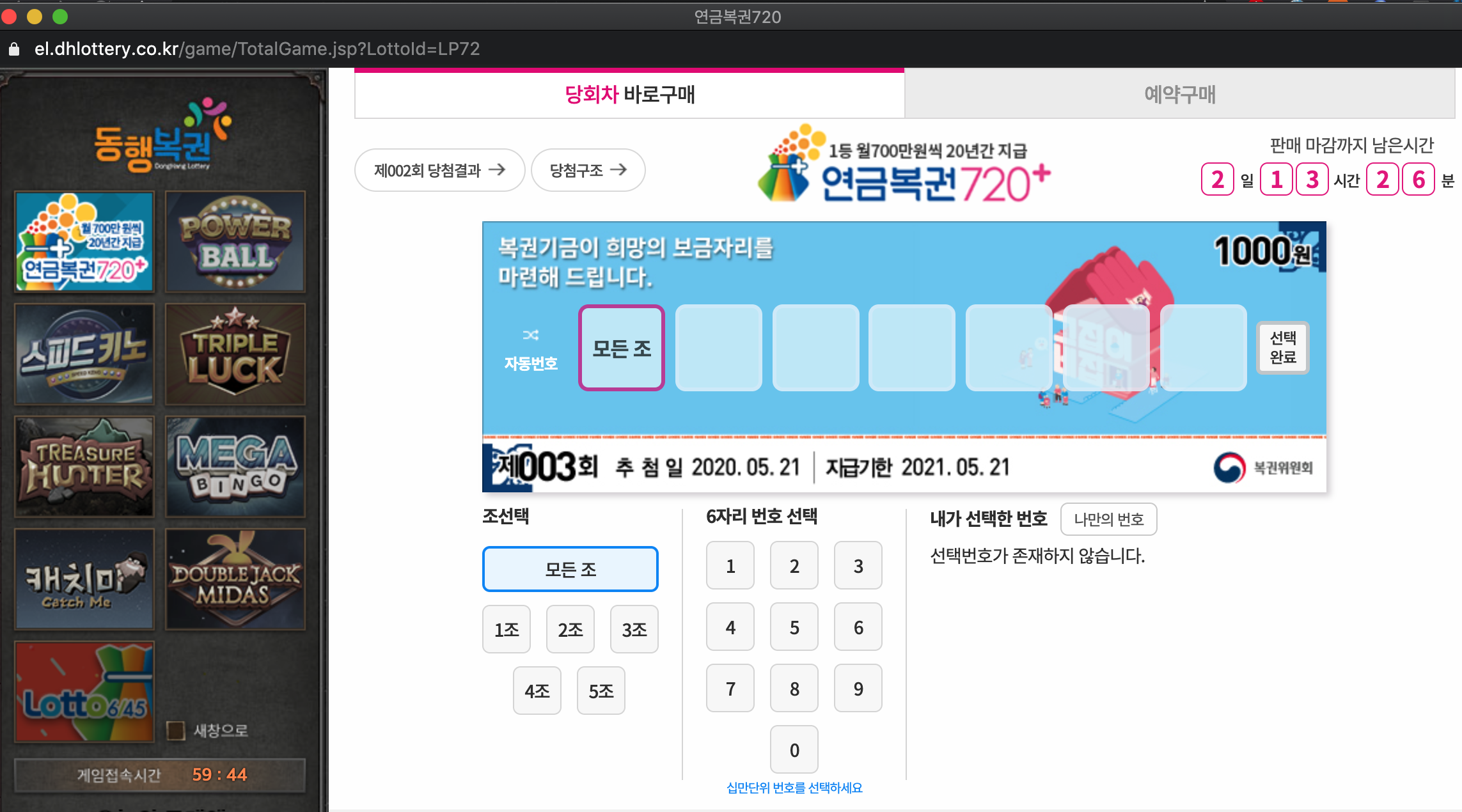 4. 연금복권 720 번호를 선택합니다. ( 수동 또는 자동 가능 )
