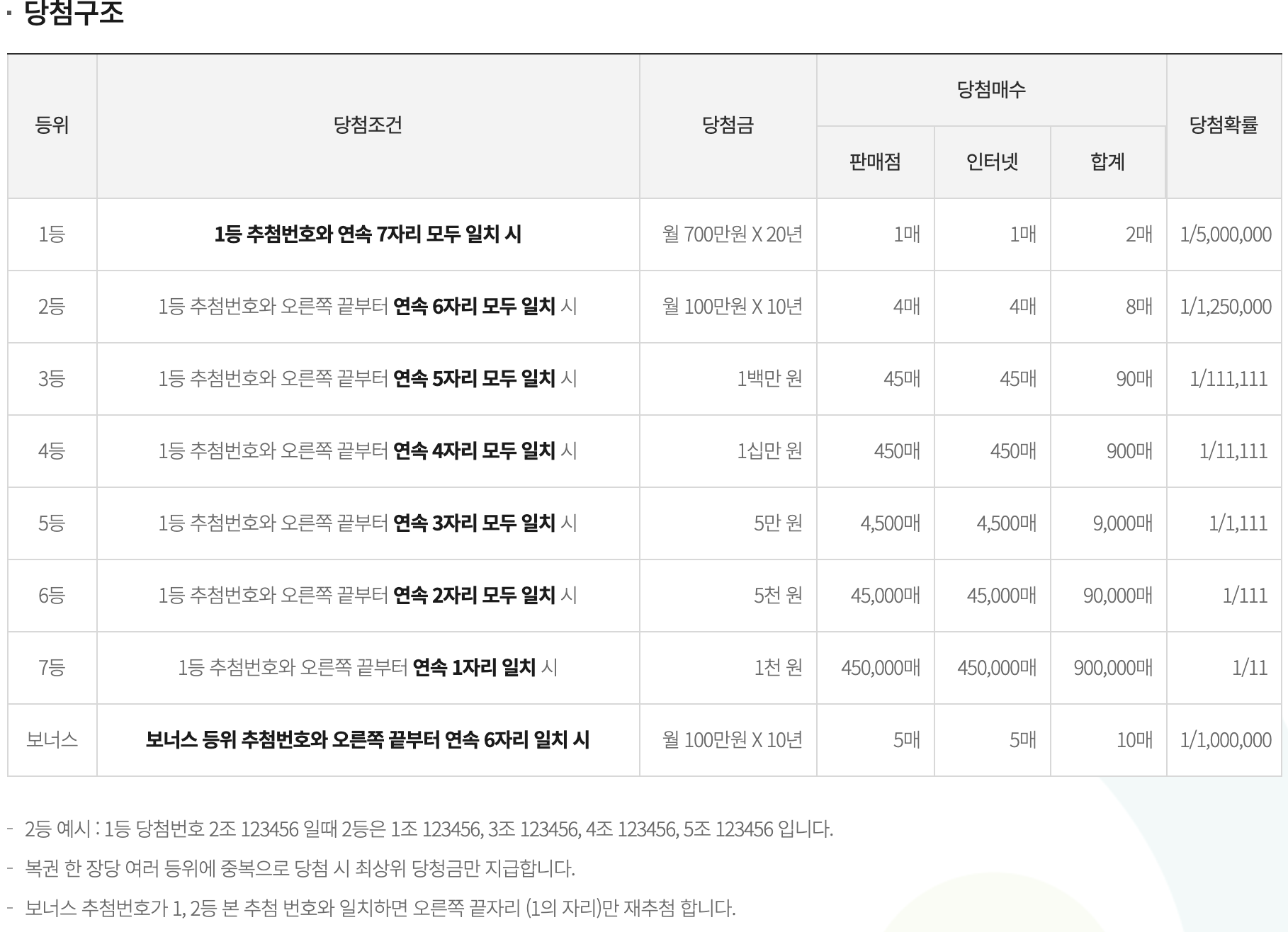 | 1등 | 1등 추첨번호와 연속 7자리 모두 일치 시 | 월 700만원 X 20년 | 1매 | 1매 | 2매 | 1/5,000,000 |