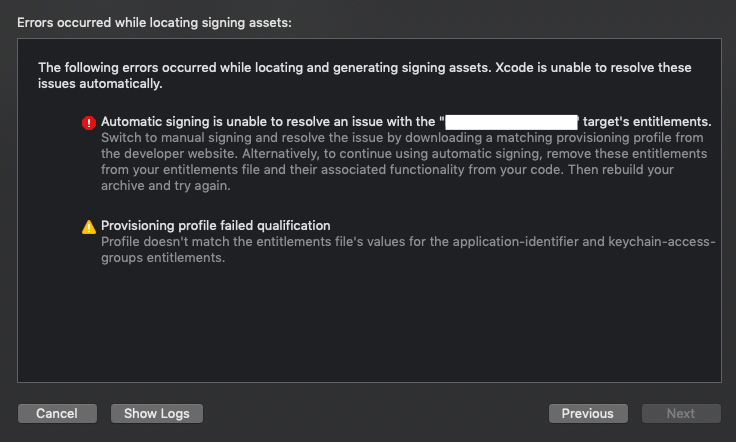 Profile doesn't match the entitlements file's values for the application-identifier and keychain-access-groups entitlements.]